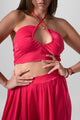 Set azul marino con estampado floral: top crop smock (nido de abeja/elástico rucheado) con mangas globo y acabado en ondas + pantalón palazzo de tiro alto, cintura elástica con lazo y bolsillos. Fresco y fluido para el verano.