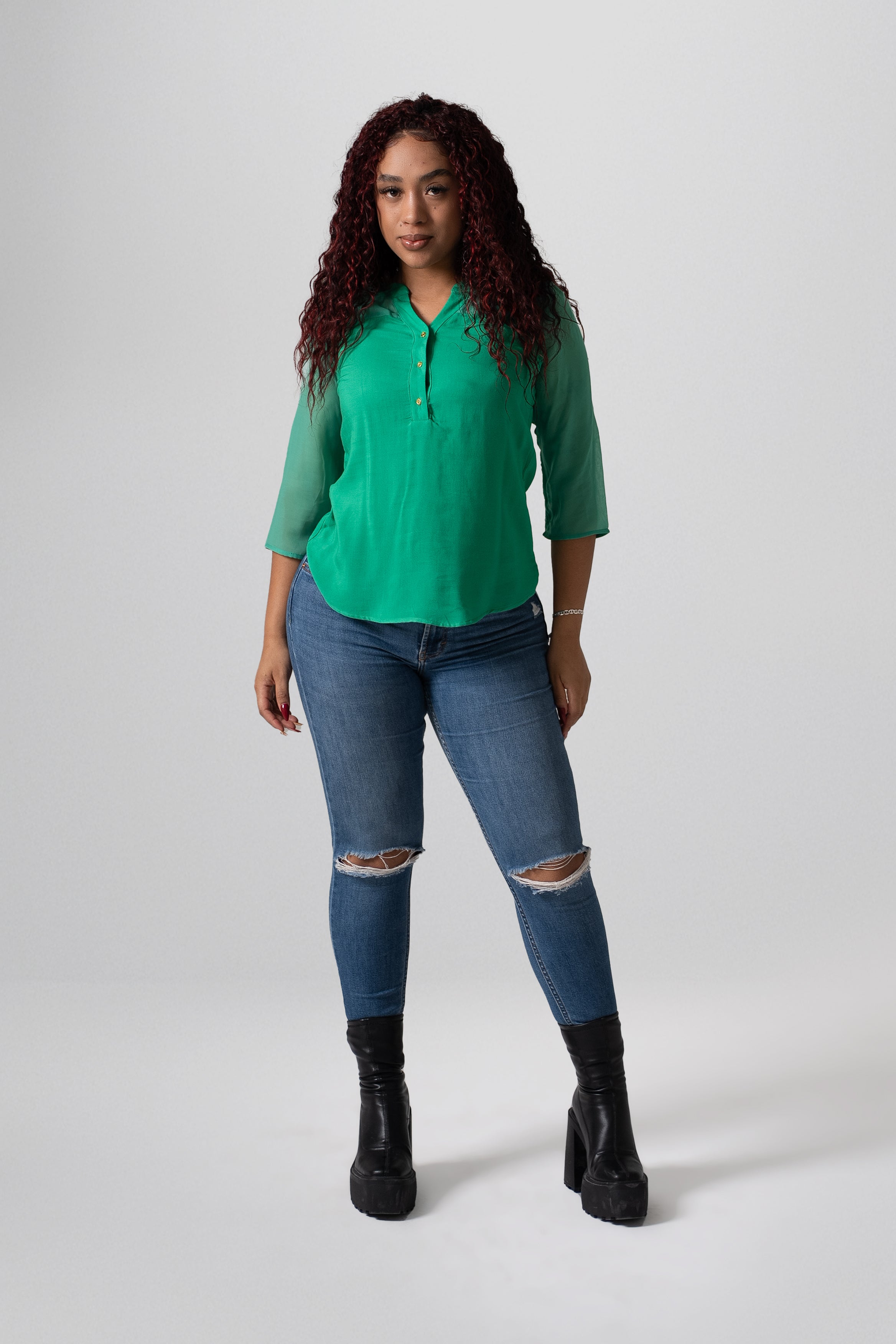 Blusa verde con cuello en V, botones frontales y mangas 3/4. Ligera y fresca para un look casual y cómodo.