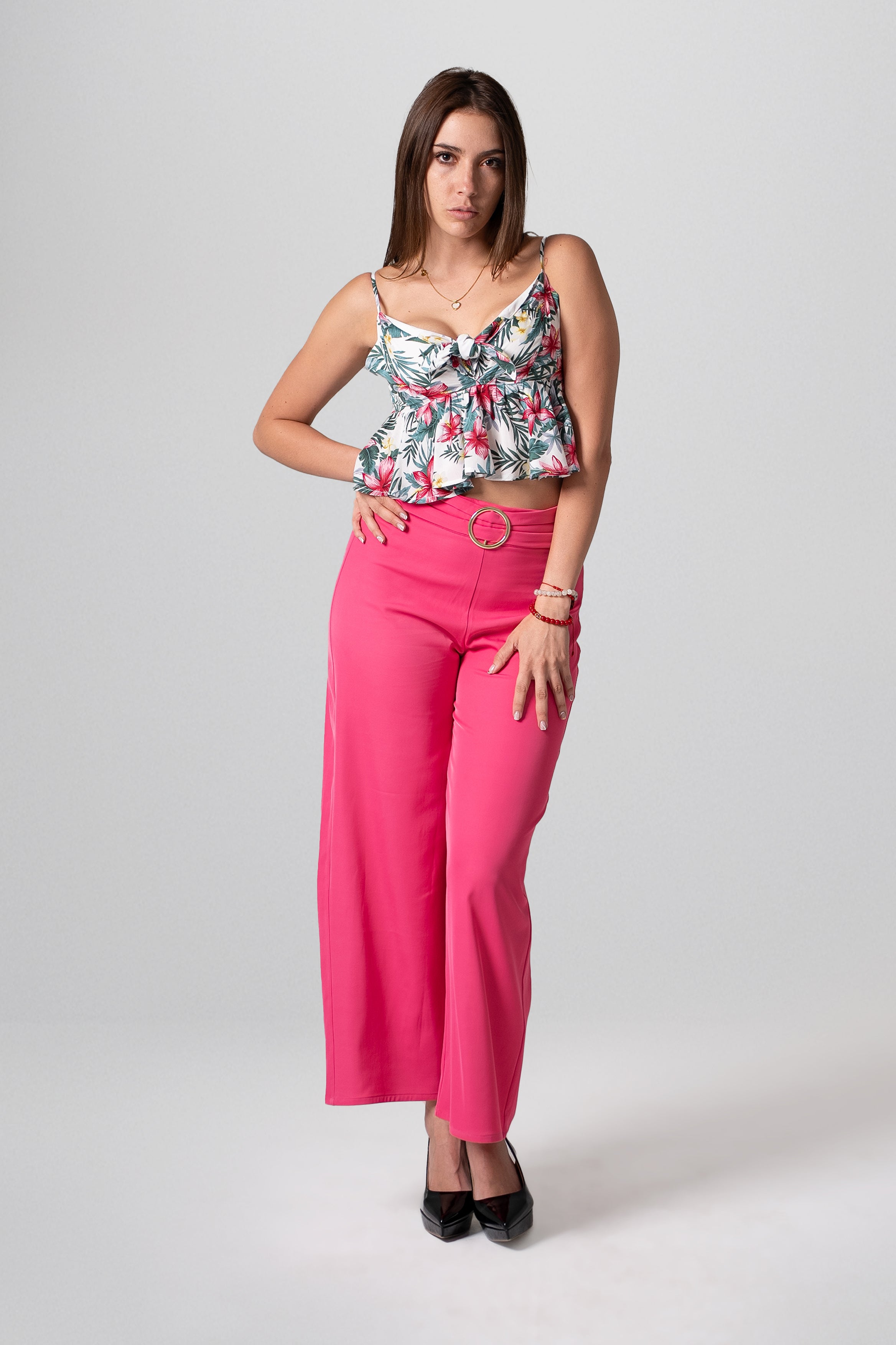 Top fresco de tirantes delgados con estampado floral tropical. Presenta un nudo frontal decorativo y caída amplia en el bajo, que aporta movimiento y un estilo veraniego. Ideal para looks casuales y vibrantes.