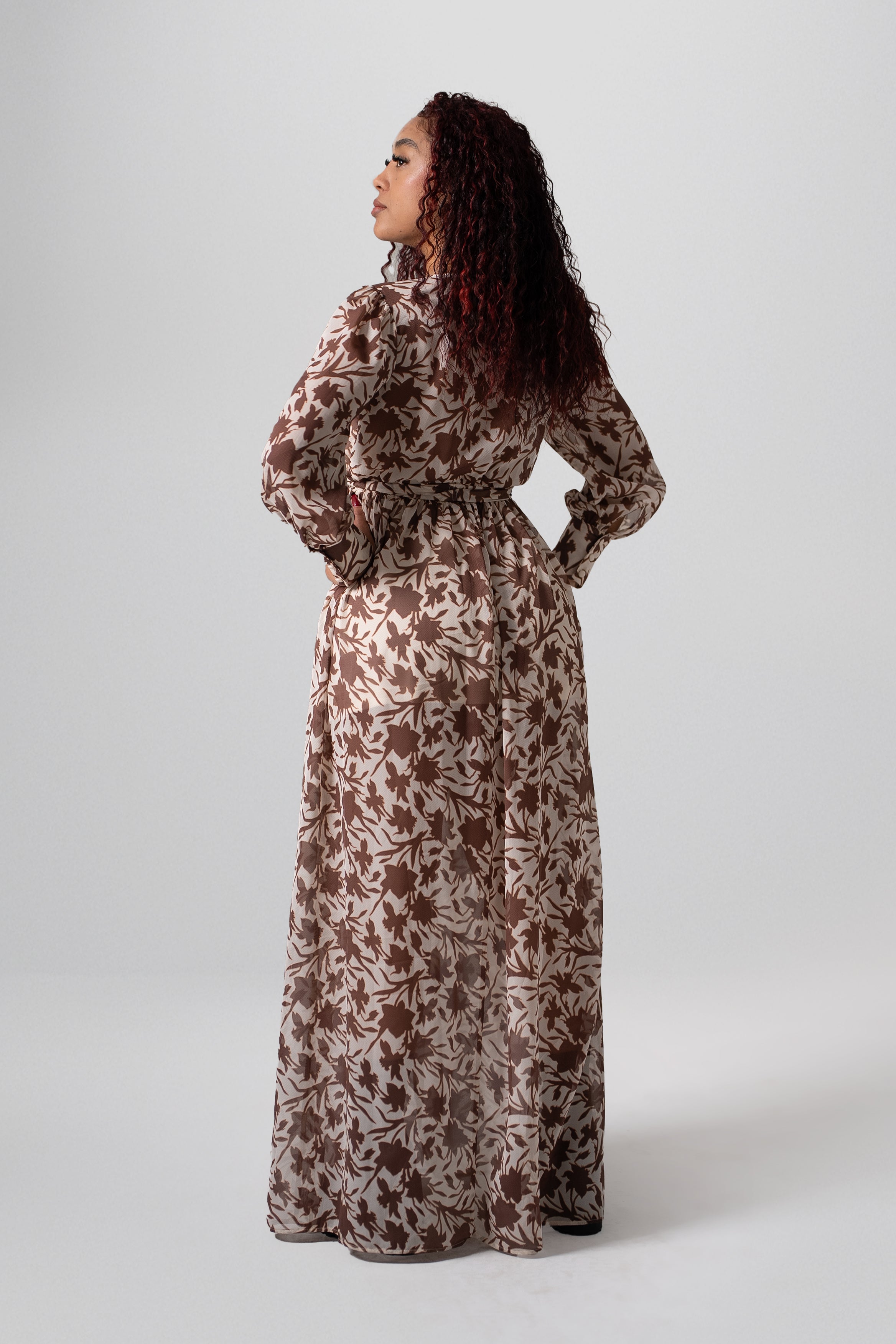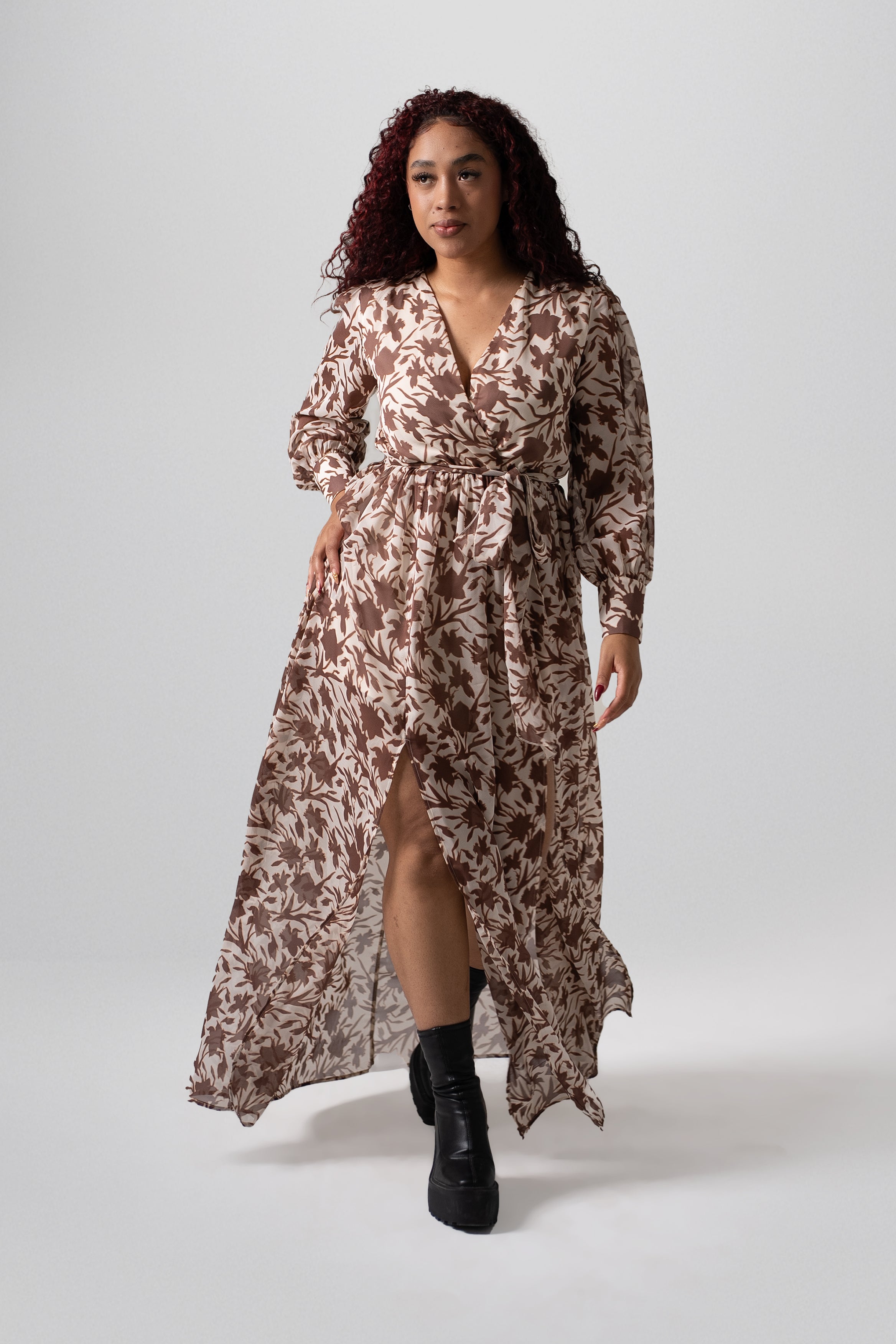 Vestido largo cruzado con estampado floral en contraste, mangas largas con puño abotonado y cinturón delgado a juego que define la silueta. Confeccionado en tela ligera y vaporosa, perfecto para un look femenino y sofisticado en cualquier ocasión.
